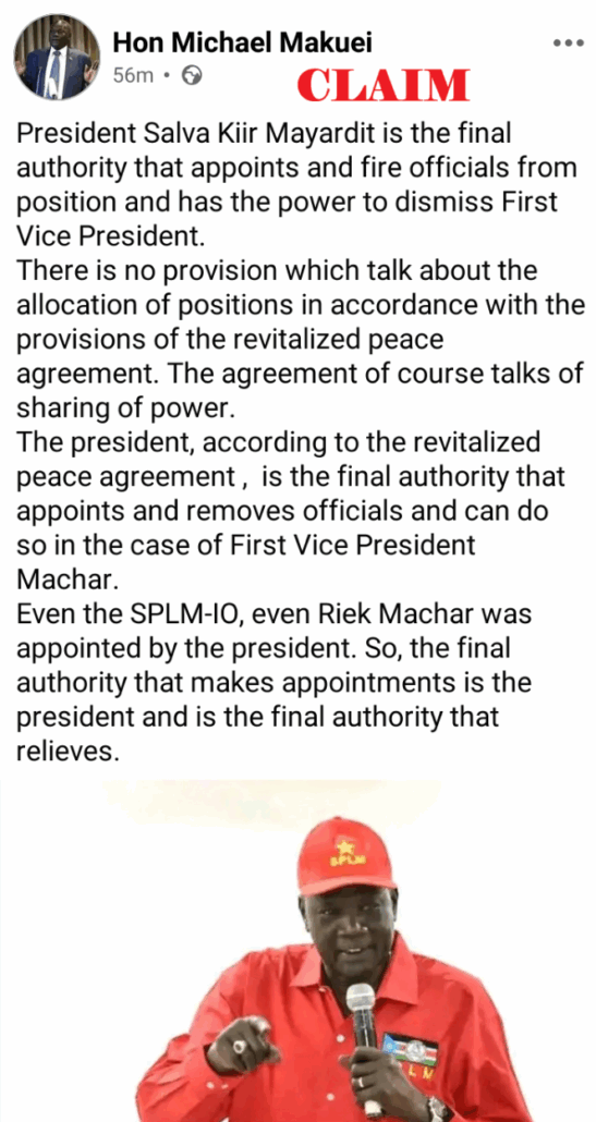 “President Salva Kiir Mayardit is the final authority that appoints and fires officials from positions and has the power to dismiss the First Vice President,” the page asserted.