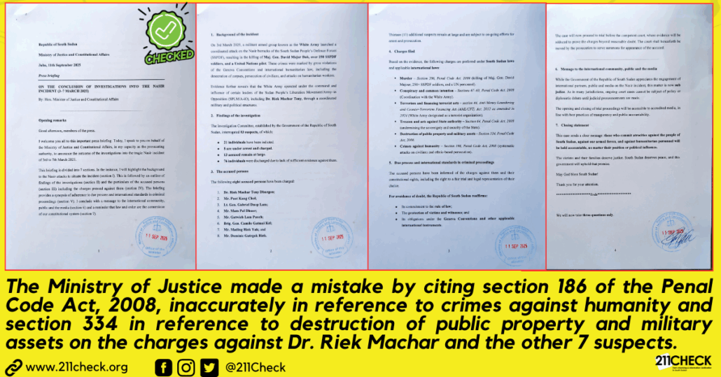 The Ministry of Justice and Constitutional Affairs made a mistake by citing section 186 inaccurately in reference to crimes against humanity and section 334 in reference to destruction of public property and military assets in the charges against Dr. Riek Machar and the other 7 suspects.